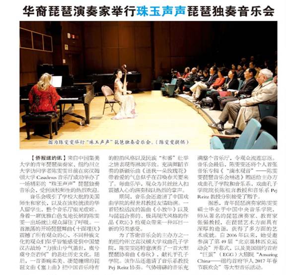 2.美国当地时间2017年3月31日晚,陈雯雯在纽约州立宾汉顿大学Casadesus Recital Hall音乐厅成功举办一场精彩绝伦的“珠玉声声”琵琶独奏音乐会,轰动了当地社会和媒体关注。其中,美国纽约《侨报》对其给予了充分的报道: