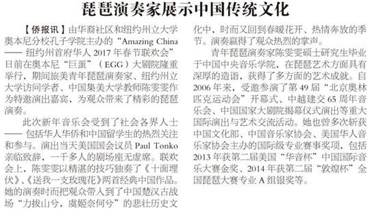 1.美国当地时间2017年2月4日(正月初八),陈雯雯作为中国特邀演出嘉宾,在纽约首府EGG大剧院“Amazing China——纽约首府华人2017年春节联欢会”上倾情演绎了精彩绝伦、震撼人心中国琵琶音乐,展示了中国传统文化。演出当天美国国会议员Paul Tonko先生亲临致辞,一千多人的剧场座无虚席。陈雯雯的演出受到美国各界人士的广泛关注,其中美国《侨报》对其给予了充分的报道:
